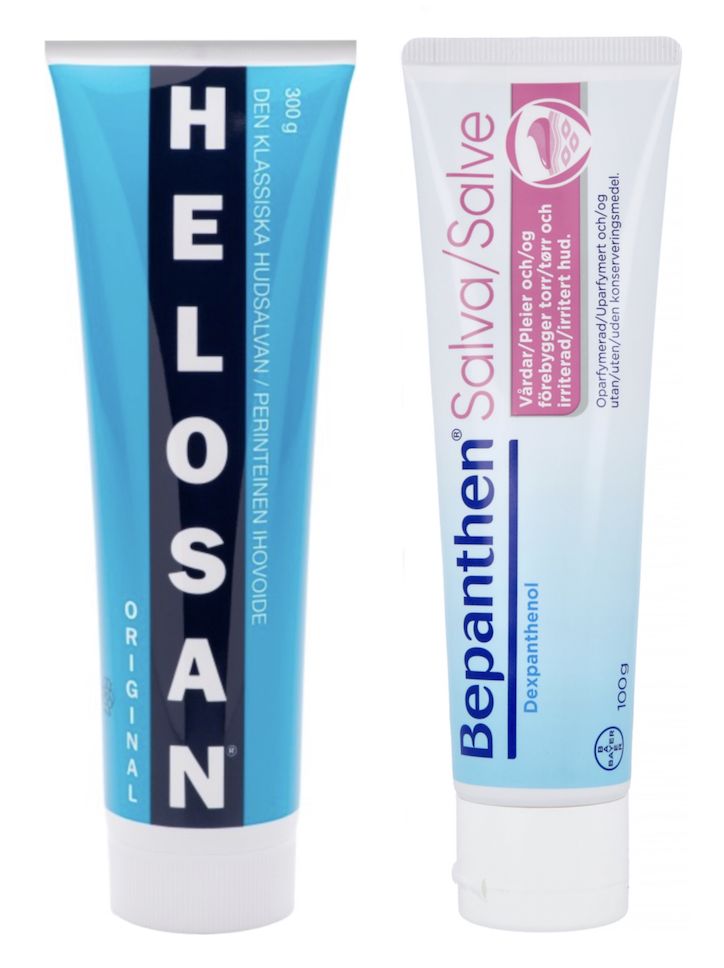 Blå Helosan salva kan du hitta i en välsorterad mataffär eller på Apoteket. Bepanthen hittar du på Apoteket.
